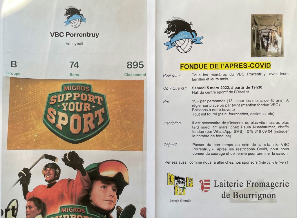 Le VBC Porrentruy invite tous ses membres, leurs familles et leurs amis à partager ensemble la fondue de l’après-Covid, samedi 5 mars 2022 à l’Oiselier. Inscription nécessaire, selon le flyer ci-contre.